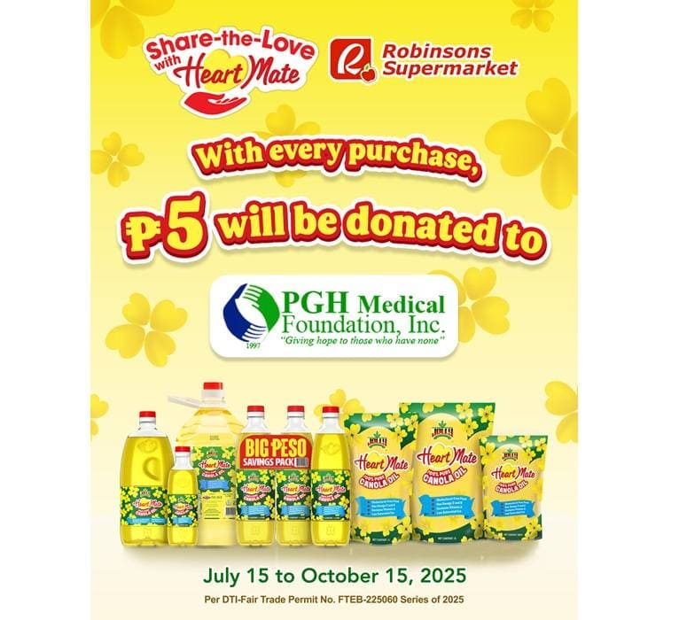 From July 15 to October 15, 2025, for every purchase of any Heart Mate Canola Oil product at any Robinsons Supermarket branches, ₱5 will be donated to the Philippine General Hospital Medical Foundation, Inc. (PGHMFI). These proceeds will help fund essential medical programs and patient care, particularly for underprivileged individuals who rely on PGHMFI for life-saving support.