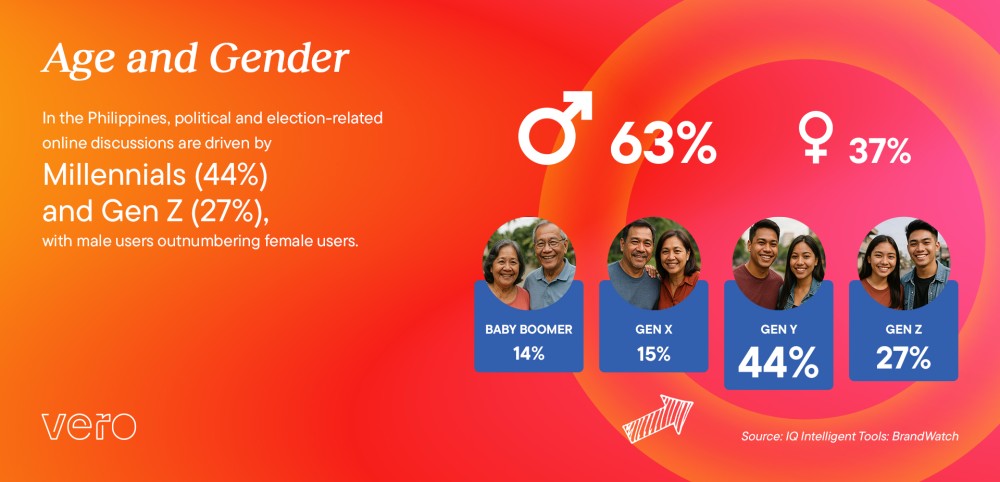 Millennials (44%) and Gen Z (27%) are the primary drivers of political and election–related discussions, especially on Facebook, which accounts for more than 86% of all buzz volume. Vero’s research also found that conversations are concentrated in Metro Manila, but there were minimal differences in terms of content between Metro Manila and the rest of the country.
